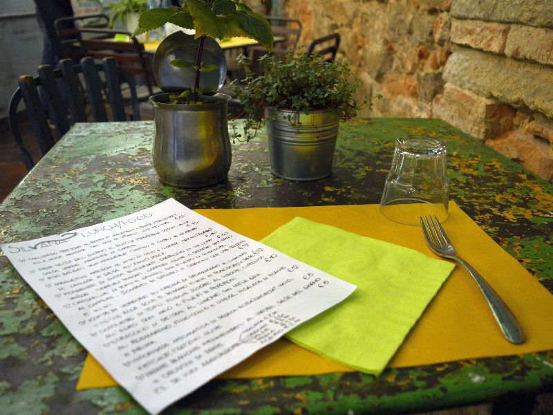 In menu, diverse le proposte: piatti a base di soia alghe cereali e crudisti all’insegna di tradizione e semplicità per un risultato assicurato. Si trovano le tagliatelle fresche al pesto di mandorle e patata kennembel alla noce moscata con nidi di bietole e uva Palieri o crespelle di tofu e spinaci con filetto di pomodoro ai capperi scottato di bietole e cerali con kiwi e uva Palieri. Per chi ama le zuppe da provare il fondente di zucca con carpaccio di melone verde, cereali tostati, capperi, olive e crostini integrali. Completano la proposta le cotolette di tofu scottate al limone cipollina all’agro con maio e filetti di peperone e gli straccetti di seitan al limone con mela Gaia al rosmarino finocchio e uvetta, insalata di fogli e frutta. Insomma un menu dove la creatività va a braccetto con la sana alimentazione.