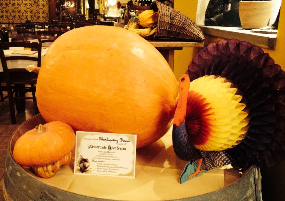 Il ristorante Accademia taglia il traguardo della 15esima edizione della cena del Ringraziamento, a Firenze. Un record incontrastato per il locale di piazza San Marco che propone la zuppa di zucca con il pane di mais, il tacchino ripieno con la salsa di mirtilli e molte altre sorprese per la sera del 26 a partire dalle ore 18.