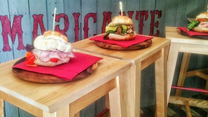 I panini imbottiti sono di diverso tipo, c’è quello con la mortadella di cinghiale al tartufo, senape antica, pecorino e peperoni marinati (6 euro), il “vegano” con zucchine, melanzane, peperoni, salsa alle cime di rapa Terra Mia (5 euro) oppure l’hamburger di porchetta artigianale e mortadella di cinghiale (servito con insalata iceberg e crema di broccoli TerraAmata, patatine) a 10 euro.