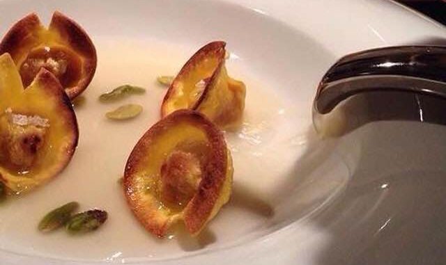 Il tortello di mortadella di Marco Martini al The Corner Roma. Ogni romano considera pizza e mortadella la merenda per eccellenza. Meglio conosciuta come “pizza e mortazza” è stata rivisitata in chiave moderna e gourmet dallo chef e patron del ristorante The Corner di Roma, Marco Martini. Come? Con un procedimento che trasforma la pizza in un brodo particolare che ne contiene tutto il sapore.