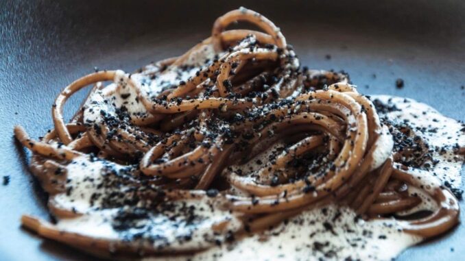 Spaghetti con aglio nero, anemoni e mandorle dello chef Luigi Nastri alla Stazione di Posta Roma