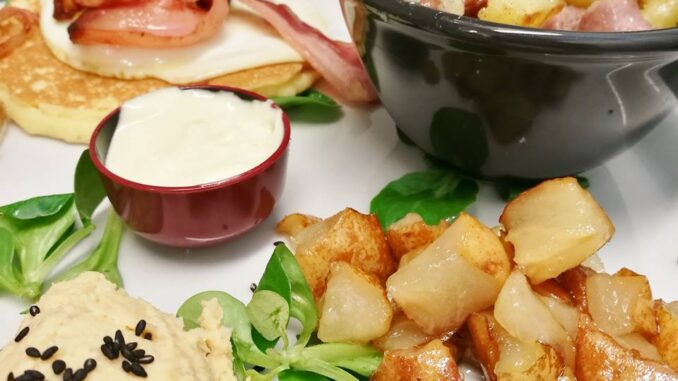 Da Parma & Co il brunch della domenica prevede, oltre alla possibilità di scegliere i piatti dal menu alla carta, un piatto completo, stile English breakfast, con ingredienti: parmigiano, salamino al vino bianco, uova al guanciale di maiale nero e fagioli al prosciutto, più un dolce a scelta.