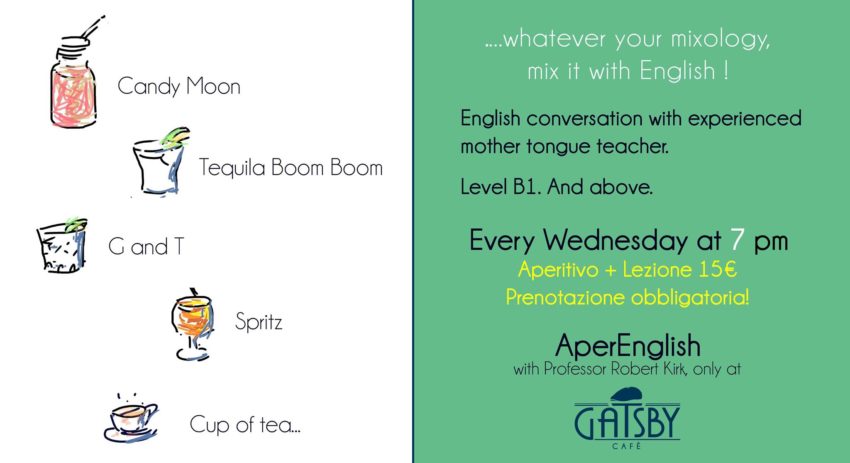 Al Gatsby Cafè inizia un ciclo di incontri per migliorare il vostro inglese all’ora dell’aperitivo. A guidarvi, l’insegnante Robert Kirk. Prenotazione obbligatoria.