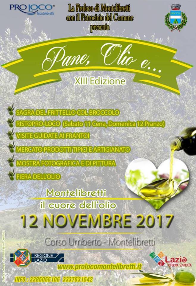 Domenica 12 novembre a Montelibretti si festeggia “l’Oro verde“, con protagonisti la Carboncella, il Frantoio, la Salviana e il Leccino, varietà di ulivi locali, che da secoli consentono una produzione di olio di inestimabile valore per la cittadina in provincia di Roma. In programma visite guidate ai frantoi, e nel centro di Montelibretti saranno allestiti locali e cantine per la Fiera dell’olio e la sagra del frittello con broccolo. Negli stand troverete vari prodotti tipici: dal tartufo, alla cioccolata artigianale, passate di frutta nei barattoli, verdure del campo sott’olio, i formaggi, il miele, il pane cotto nel forno a legna, i dolci fatti in casa, le marmellate e i prodotti biologici, e ovviamente l’olio locale.
