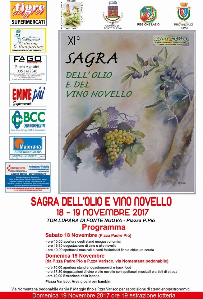 Undicesima edizione della sagra dell’olio e del vino novello organizzata dalla Pro Loco di Fonte Nuova. All’evento saranno presenti le aziende produttrici di olio e del vino di tutto il Lazio, oltre che di numerosi stand enogastronomici di prodotti tipici. Presenti all’evento anche food track e gli stand delle aziende di Amatrice e Norcia colpite dal sisma.