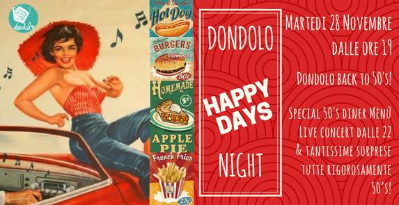 Solo per questa sera Dondolo cambia veste e entra nella magica atmosfera degli anni ’50. Tra le novità per la serata: Special 50’s Diner Menu e Live concert dalle 22 con gli Sgabellos. In onore dell’apprezzato telefilm “Happy Days“, troverete i panini (tutti serviti con patatine fritte): RICKY CUNNINGHAM: hamburger, cheddar, ketchup, maionese, cetriolini, lattuga, pomodoro; FONZIE: hamburger, bacon,bbq, cipolle fritte, lattuga, pomodoro; ALFRED: pollo fritto, chilly, guacamole, salsa tartara, bbq, lattuga, pomodoro; MARION: hamburger, salsa aioli, avocado, lattuga, pomodoro; JOANIE: burger di melanzane e patate, pomodorini confit, scaglie di grana, maionese al basilico, lattuga; RALPH: Hot dog, maionese, ketchup; WARREN: Hot dog, senape in grani, crauti.