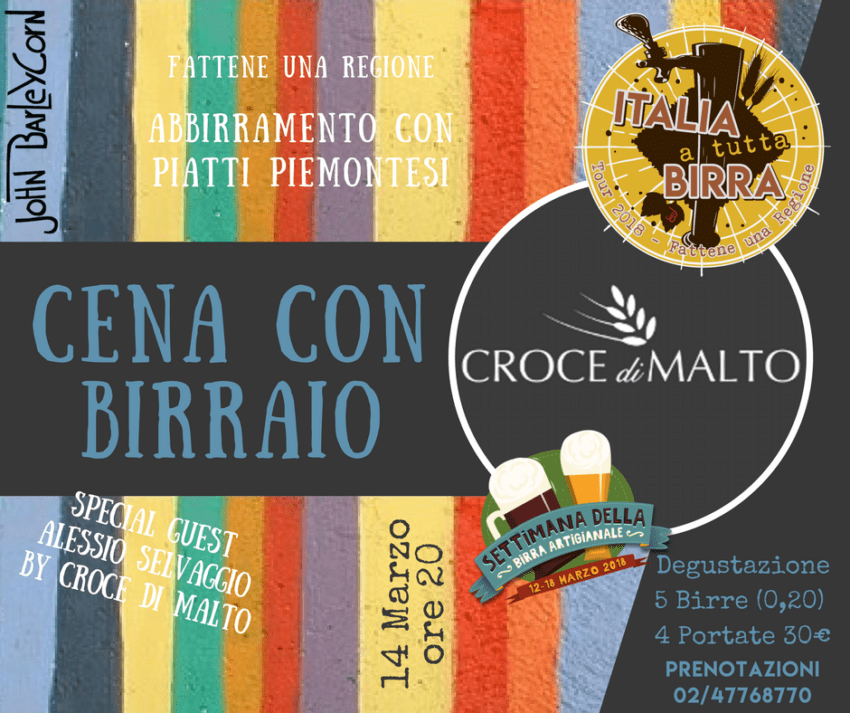 In occasione della Settimana della birra artigianale, nuovo appuntamento di ‘Italia a tutta Birra. Fattene una Regione’ del John Barleycorn Milano. Il tour fa tappa in Piemonte con il Birrificio Croce di Malto: in degustazione le 5 Birre On Tap in abbinamento a 4 piatti della tradizione piemontese: HAURIA, Kolsch di Benvenuto; 19’72, Saison con Albicocca e Vitello Tonnato; RUS, Red Rice Bitter e Tajarin con Ragù Langarolo; German Wave, Italian Pale Lager e Tartare di Fassona; Dhu It, Raspberry Stout e Baci di Dama al Cioccolato e Lampone. Sarà presente Alessio Selvaggio, Birraio di Croce di Malto.
