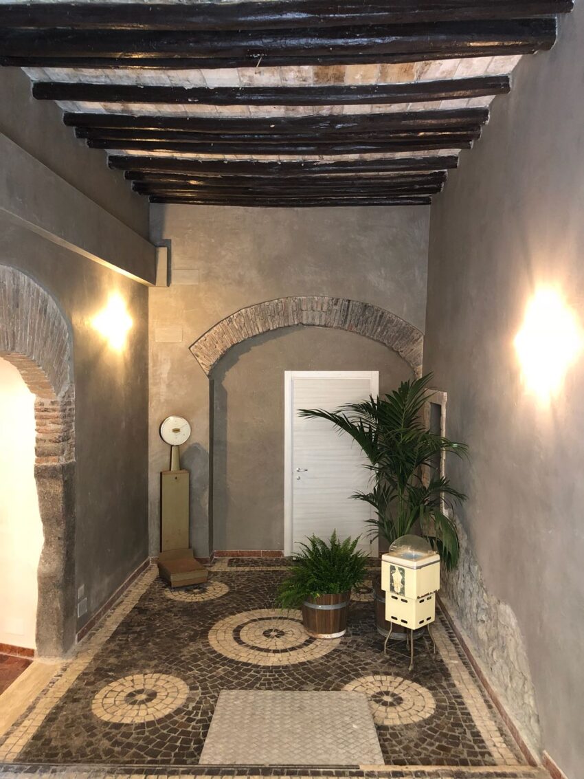 Gli interni del locale sono stati arredati per richiamare l’ambiente tipico della realtà rurale, con volte di mattoni sul soffitto, pareti chiare e tavolini in legno, senza mai tralasciare la cura del dettaglio dei materiali e della mise en place.
