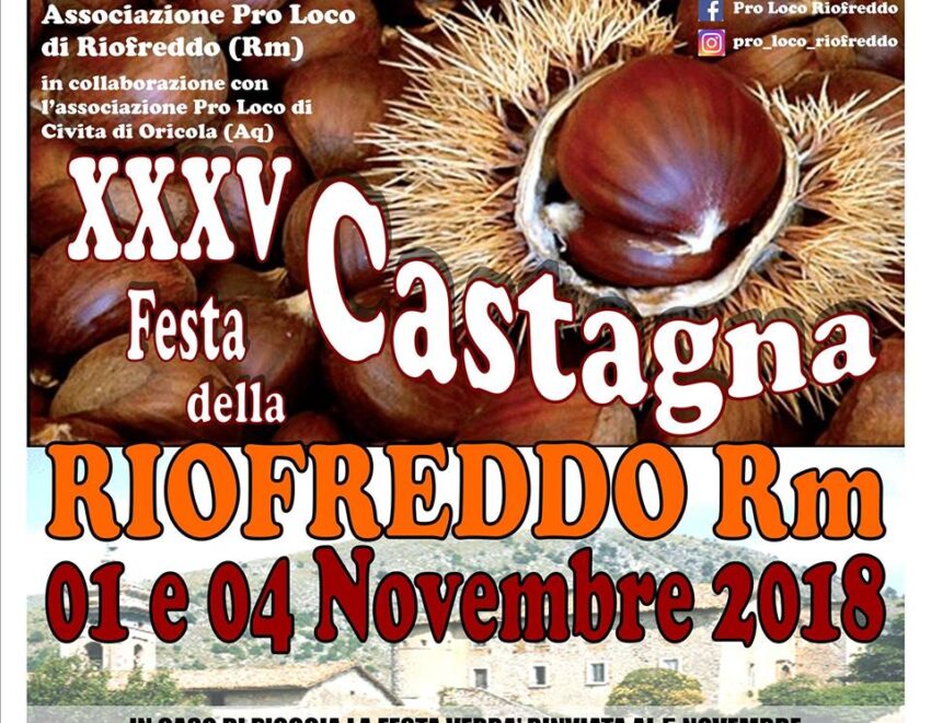 La Festa della castagna di Riofreddo è un percorso semplice ma suggestivo per le vie del borgo con la possibilità di degustare a partire dalle ore 12 (al costo di 15 euro), bruschette, polenta servita su scifetta in legno (in alternativa fettuccine ai funghi tartufati), arrosticini e salsiccia alla brace (in alternativa arista al profumo di castagna); dolci tipici; castagne arrosto; pane e bibite. Inoltre avrete la possibilità di passeggiare liberamente nel bosco delle castagne “Le Pacetta” con raccolta libera.