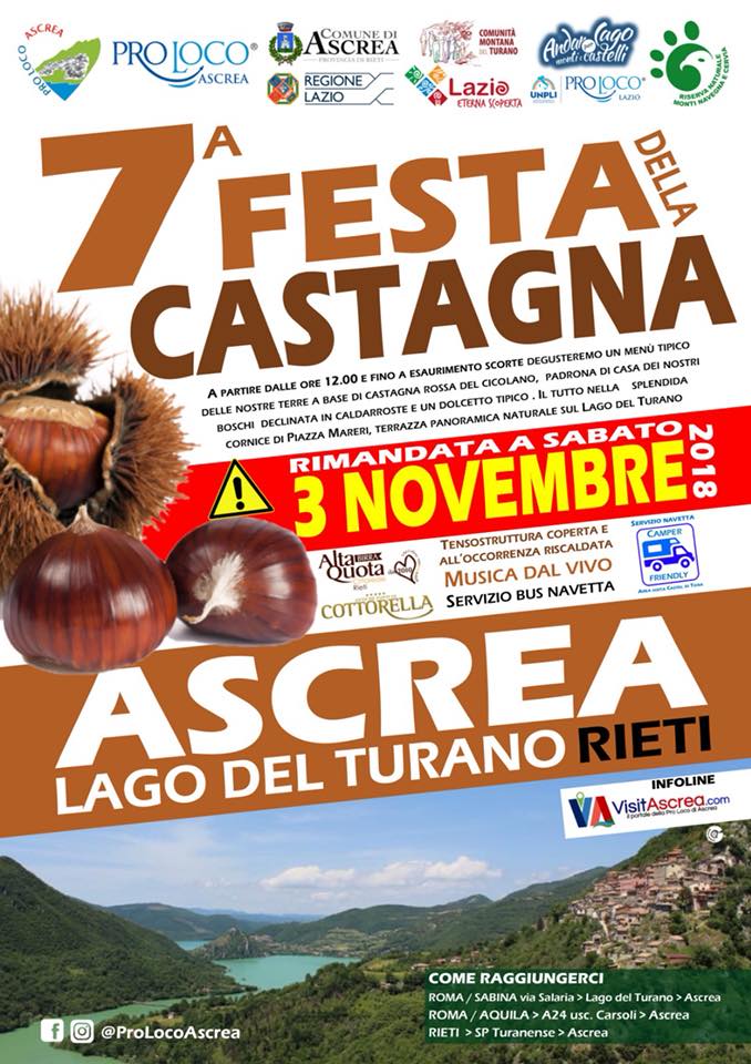 Domenica 3 novembre la festa della castagna si tiene ad Ascrea, in provincia di Rieti. A partire dalle 12 e fino a esaurimento, degustazione del menu tipico delle terre a base di castagna rossa del cicolano, declinata in caldarroste e un dolcetto tipico.