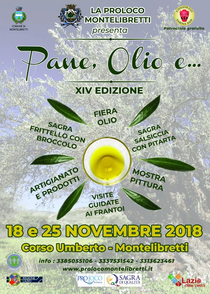 Domenica 25 novembre il borgo di Montelibretti non offrirà solo una gustosa carrellata di piatti tipici locali, esaltati dal sapore e dal profumo dell’olio extravergine di oliva, ma un vero e proprio viaggio in un universo tutto da scoprire che prevede anche visite ai frantoi. Qui sarà spiegato il processo di lavorazione dell’oliva e dell’imbottigliamento dell’olio, e si vivrà l’esperienza della degustazione dell’olio nuovo sulle bruschette; non mancheranno dimostrazioni sulla lavorazione del pane con assaggi di prodotti da forno cucinati al momento.