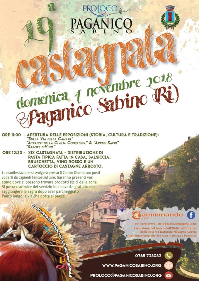 La castagna, il frutto rappresentativo per eccellenza dei boschi del reatino, torna protagonista nell’evento autunnale di Paganico Sabino: la XIX edizione della Castagnata Paganichese. Come corona del pasto completo, assaggerete la caldarrosta.
