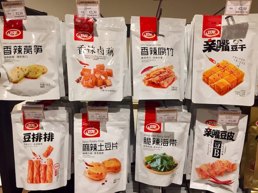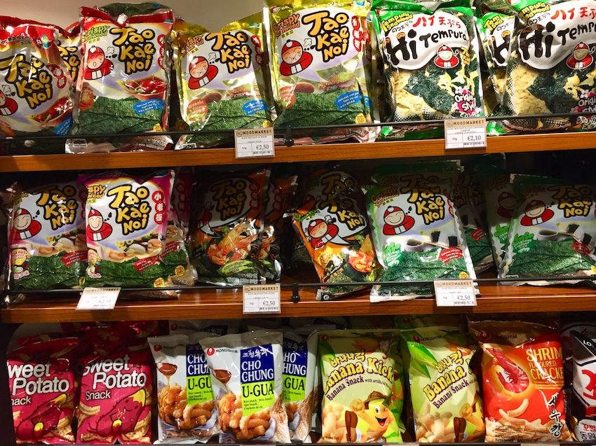 Apri e gusta per i tantissimi snack. Come quelli “fighetti” con soia, tofu aromatizzato, alghe, bambù, da 1 a 3,50 euro, esposti al piano superiore insieme a gadget, stoviglie e cosmetici naturali.