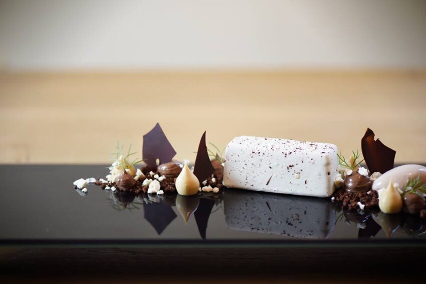 e come secondo Carrè d’abbacchio in crosta d’erbe spontanee, carciofi stufati e patata morbida leggermente affumicata. Il dolce presentato è un semifreddo alla pastiera, crumble di colomba e crema al gianduia.