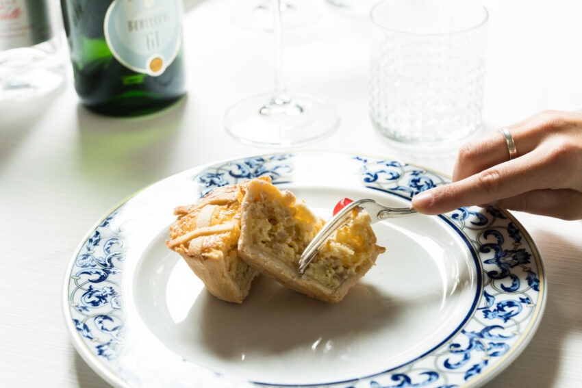 Tortelli ripieni di Carciofi alla Brace, Alici, Limone e Provola; Risotto Fave e Pecorino Di Gregorio; Agnello, Asparagi e Ricotta Salata; Muesli di Cereali Cremoso al Fondente e Gelato alla Colomba; Petit Four.