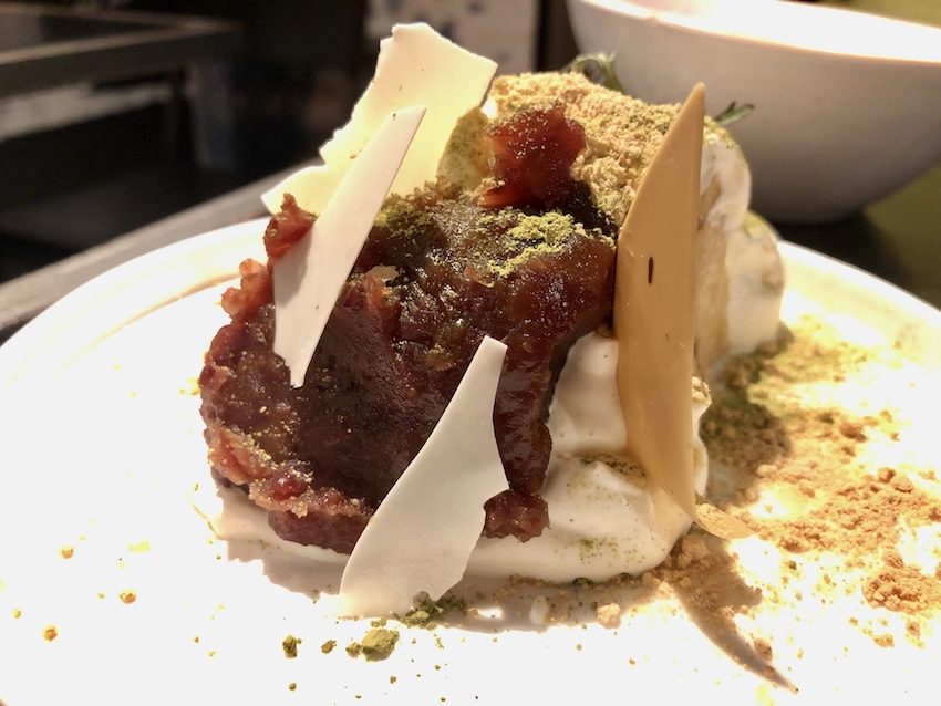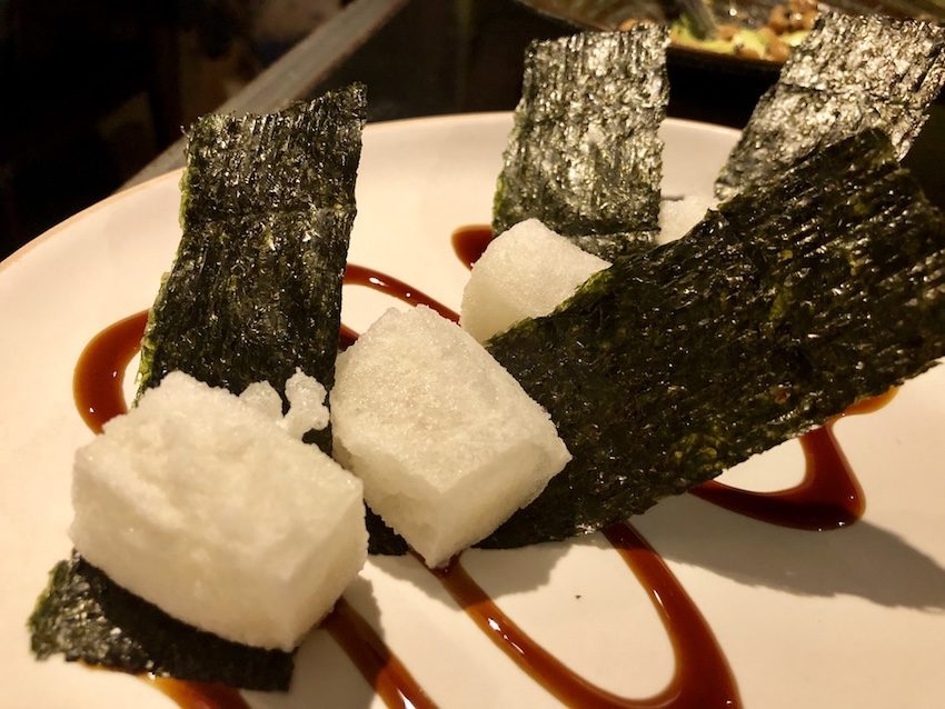 Curioso anche lo Yakimochi, mochi fritto da raccogliere in un foglio di alga nori, passare della salsa della chef, a base di soia, e gustare in un boccone: che i mochi, si sa, al morso “attaccano” un po’.