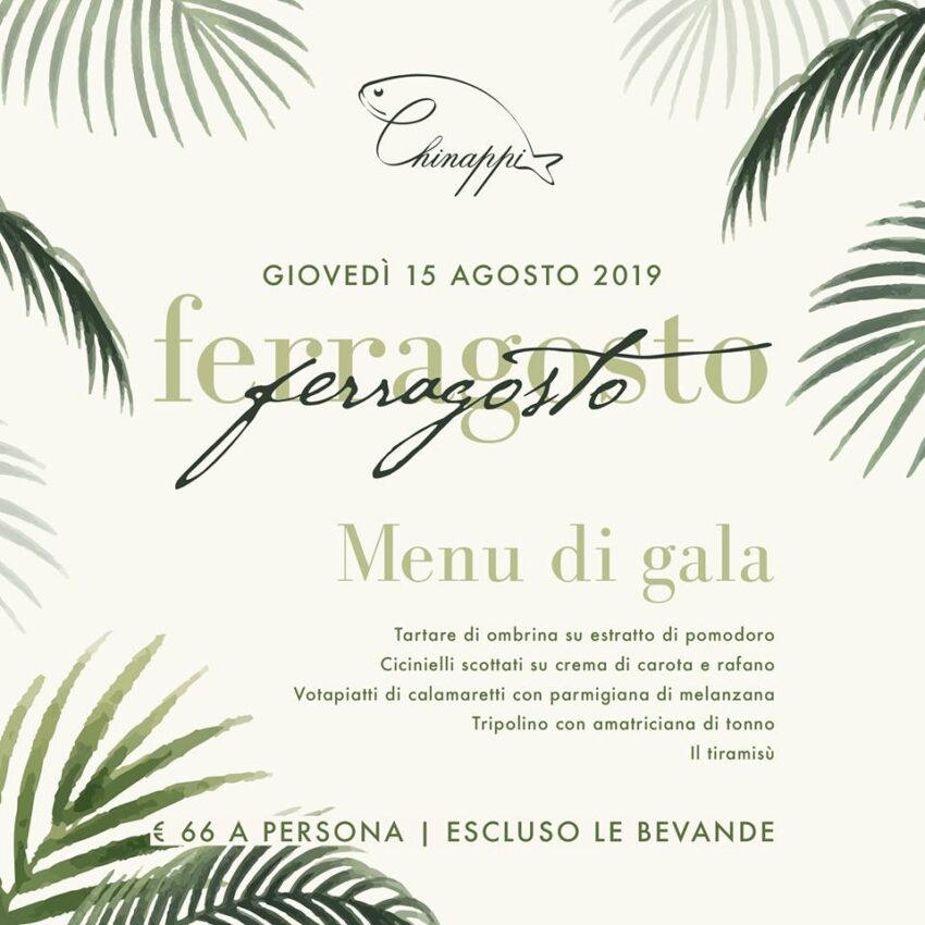 Per il giorno di Ferragosto, sia a pranzo che a cena, è previsto da Chinappi un menu speciale creato ad hoc per l’occasione. Il menu prevede 5 portate: Tartare di ombrina su estratto di pomodoro; Cicinielli scottati su crema di carota e rafano; Votapiatti di calamaretti con parmigiana di melanzana; Tripolino con amatriciana di tonno; il tiramisù di Chinappi.