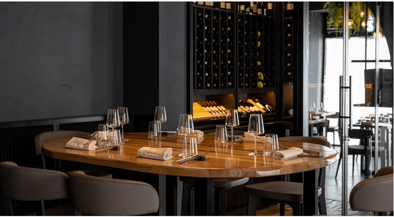 Il locale ospita una quarantina di coperti. E’ raffinato e attento ai dettagli, dai pavimenti ai soffitti, dagli elementi di arredo ai tavoli realizzati artigianalmente da maestranze anche loro made in Anzio. Ampie vetrate incorniciano gli ambienti di chiaro stampo industriale e la cucina a vista.