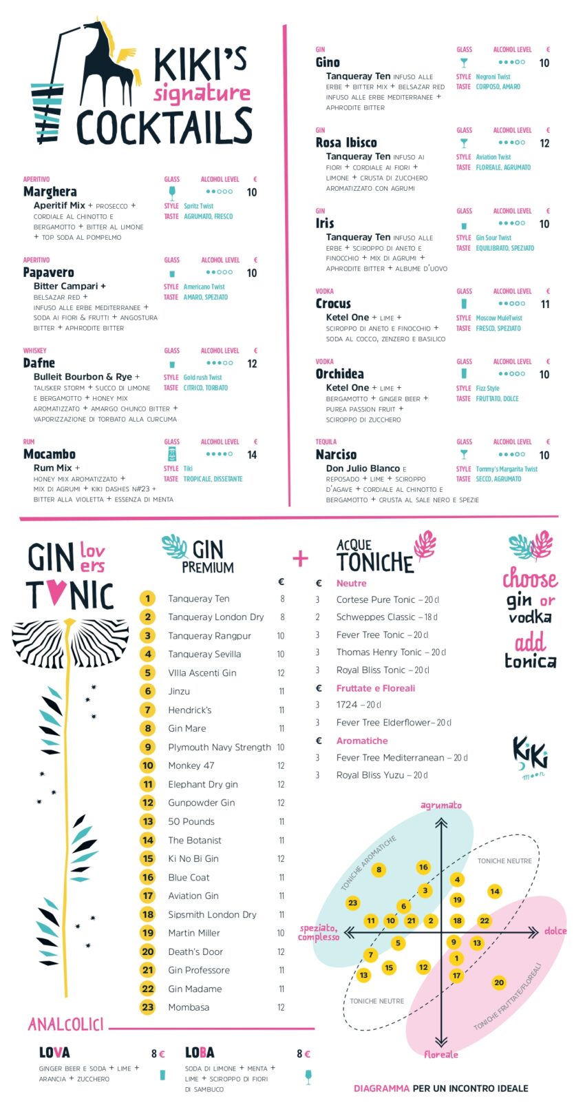 Il Kiki Moon ha una carta dei vini dinamica e variegata e una drink list quasi infinita, ideata dal barman Walter Pili che ha trasposto ai cocktail il carattere bucolico del locale.