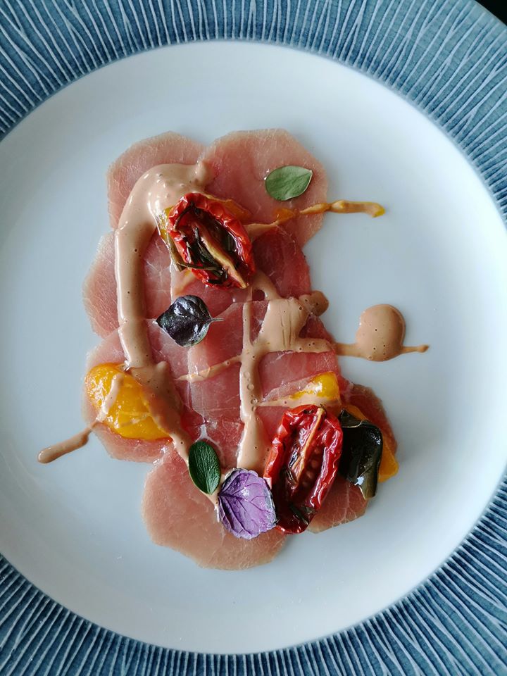 Ostrica e calice di prosecco; degustazione del nostro pane fatto in casa e olio; cappesante scottate indivia fois gras dei romani pomodorino glassato; carnaroli cacio e pepe gambero rosso rucola e topinambur; paccheri guanciale croccante e pomodorini polpo rosmarino e broccolo marinato; carpaccio di avocado spinaci bavetta di Ricciola paglia e fieno leggermente affumicata e yogurt alla curcuma; predessert; semifreddo al passion Fruit cioccolato al peperoncino e lingua di gatto al cocco.