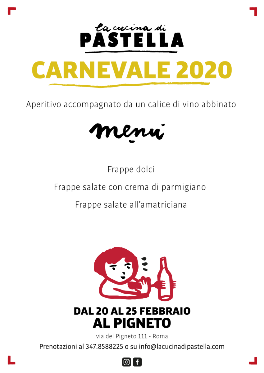 Da giovedì 20 a martedì 25 febbraio, all’orario dell’aperitivo, La Cucina di Pastella serve frappe con diversi condimenti: frappe salate con crema di parmigiano; frappe salate all’amatriciana; le classiche frappe dolci. Le frappe saranno accompagnate da un calice di vino abbinato.