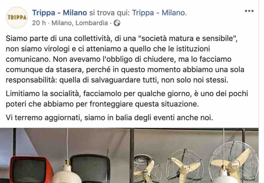 Quello che è certo è che questa situazione sta già creando e creerà un danno economico gigantesco, difficile da calcolare. Sono molti i locali che hanno bloccato non solo le forniture di cibo e di vino, ma anche i pagamenti. Si può immaginare cosa voglia dire per distributori, agenti e produttori di vino e di cibo? E si può immaginare cosa può significare per dipendenti e collaboratori che verranno lasciati a casa o non pagati? Per i ristoranti non va meglio. Perché è vero che non c’è obbligo di chiusura, per ora, ma il giro di affari si è comunque considerevolmente ridotto. La gente preferisce stare a casa, ordinare dalle app, cucinarsi da solo. Alcuni ristoranti milanesi – da Trippa a Al Mercato a Bon Wei – hanno deciso di stare chiusi. Per “solidarietà”, come Trippa, ma anche perché il clima è tale che quasi non conviene stare aperti in queste condizioni.