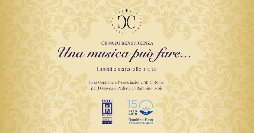 Cena di beneficenza questa sera da Casa Coppelle organizzata con ABIO Roma – ODV, associazione beneficiaria del ricavato che sarà interamente destinato al progetto “Una Musica Può Fare…”: iniziativa di empowerment terapeutico promossa dall’Ospedale Pediatrico Bambino Gesù. La cena ha l’obiettivo di raccogliere fondi per un corso/laboratorio di musica organizzato per i piccoli pazienti affetti da importanti forme di epilessia ed altre forme di gravi patologie neurologiche, in cura presso l’Ospedale Pediatrico Bambino Gesù. Il costo della cena, con menu degustazione a 7 portate, sarà di 120 euro a persona (offerta minima per essere presenti all’evento) comprensivo anche di bevande e vino. Ecco il menu della serata: Antipasti: Catalana di gamberi, yogurt al mandarino, infuso di mela verde e verdure di stagione; Foie Gras al torchon con pera Martin Sec e brioche parisienne. Primi: Calamarata orientale “Pastificio dei Campi” con ragù di scorfano; “Riso Buono” Carnaroli Gran Riserva all’Amarone, Castelmagno e cioccolato. Secondo: tournedos di filetto di manzo al pepe rosa e spugnole. Predessert: Crumble al pistacchio e sorbetto al lampone. Dessert: Noisette.