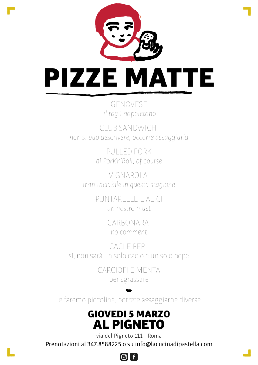 Il 5 Marzo La Cucina di Pastella sforna 8 diversi tipi di pizza da assaggiare: Genovese (il ragù napoletano); Club sandwich; Pulled pork (di Pork’n’Roll); Vignarola; Puntarelle e alici; Carbonara; Caci e pepi; carciofi e menta.