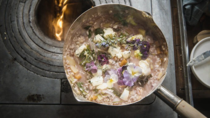 Ricetta risotto 50 Sfumature di Blu. Un risotto particolare realizzato con verdure di stagione da Riccardo De Prà, chef del ristorante stellato Dolada di Pieve d’Alpago (in provincia di Belluno). La ricetta del Risotto 50 Sfumature di Blu ha anche un tocco in più: la sapidità accesa del formaggio erborinato. Ecco come realizzarla passo passo.