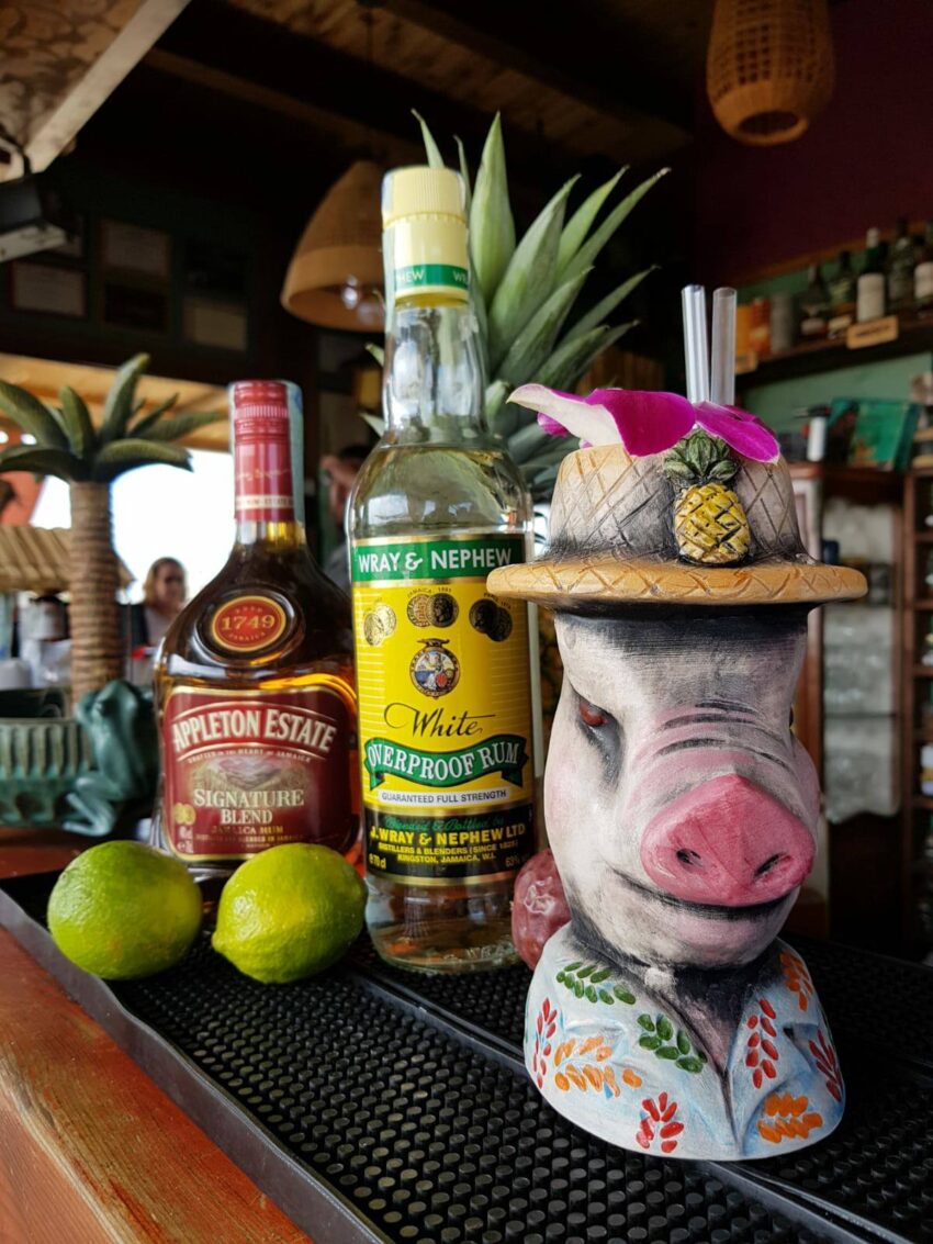 I bicchieri di servizio dei drink tiki vengono chiamati mug: sono bicchieri in ceramica che raffigurano volti o figure umane che rimandano ai paesi polinesiani o altri luoghi esotici, quella personalizzata del Creuza de Mä è la testa di un maialino con un cappello di paglia e camicia floreale, che viene usata per lo “Zombie” drink a base di tre tipi di rum, succo di lime, succo di ananas, sciroppo al passion fruit, angostura e bitter (10).