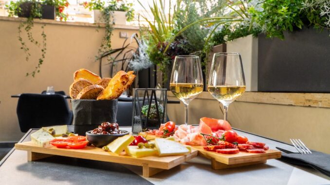 All’ora dell’aperitivo, che si protrae fino alle 21, l’atmosfera del Dafne Garden Cafè si fa più soffusa. Vengono serviti taglieri di salumi (12 euro) e di formaggi (12) o misti (da 15 a 25 euro), in abbinamento a una carta di vini naturali, sei rossi e sei bianchi, e alcune bollicine. Unico brand di birra presente è Birra del Borgo, con una postazione sia per la spina che per le bottiglie.