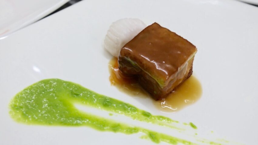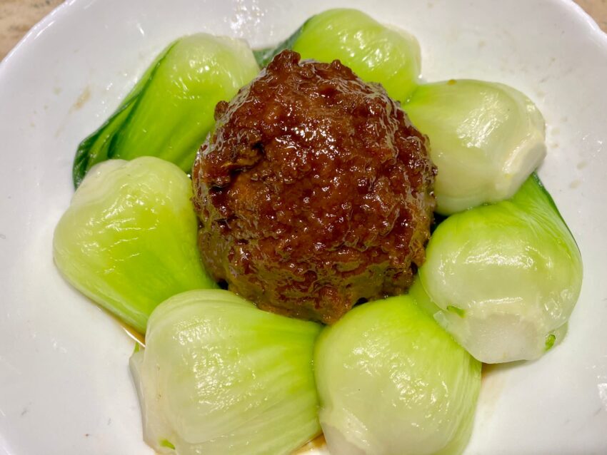 Questa polpetta è uno dei piatti simbolo dell’Est della Cina: il suo nome, “Testa di Leone”, deriva dal particolare impiattamento, dove la polpetta rappresenta la testa del leone e il Bok Choy la sua criniera. Il segreto è nella morbidezza della carne, ottenuta grazie a un procedimento manuale molto lungo. Il macinato viene messo all’interno di contenitori, a cui vengono aggiunti piccoli pezzi di grasso di maiale, per poi sbattere il tutto per circa quattro ore, in modo che il grasso, spargendosi in maniera uniforme sulla carne, riesca ad ammorbidirla. A questo punto può avere inizio la cottura: si friggono rapidamente le polpette, quindi passate in un grosso wok dentro un brodo a base di alice stellato, alloro e varie spezie, dove restano per cinque ore. Nel frattempo il Bock Choy viene messo in un wok con acqua bollente per diventare lucido e infine cotto con olio, aglio e zenzero.