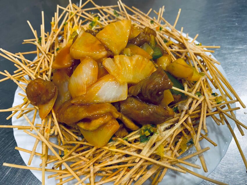 La particolarità di questo piatto è da ritrovarsi nel nido di spaghetti croccanti, la cui preparazione, mutuata dalla scuola di Shangai, è complessa e sicuramente originale. Gli spaghetti crudi vengono conditi, bagnati e infine messi nell’olio bollente, per poi venire “incastrati” all’interno dei fori del classico colino cinese, così da restare immobili durante le cottura. Questo processo genera due vantaggi: garantisce la durezza e la croccantezza degli spaghetti e dà contemporaneamente la forma del nido, grazie alla silhouette del colino. Per preparare il maiale il procedimento è classico: viene fatto marinare con albume, sale, pepe, vino di riso, olio di sesamo, quindi cotto in un pentolone con anice stellato, zenzero, erba cipollina e cipollotto, infine fatto brasare per un’oretta circa, così da mantenere la morbidezza. L’ultimo passaggio è quello del salto, che può essere fatto a piacere: in questo caso sono stati utilizzati ananas e peperoni.
