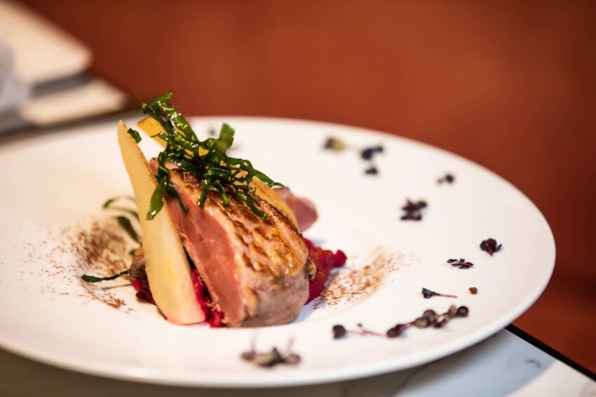 Abbraccio dell’anatra su purea di barbabietola con croccante di bietolina, pere cotte nel vino bianco e polvere di cioccolata