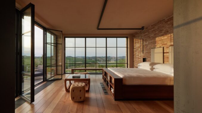 Il design si mescola persino ai vigneti e alla natura con l’unica camera che non rientra nelle due cascine ristrutturate ma che è invece sospesa tra i filari, evoluzione elegante della classica casetta sull’albero.