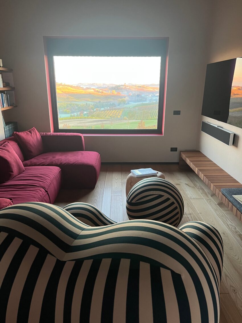 Grandi vetrate e finestre anche nelle suite, per non perdere nulla della natura circostante, da ammirare in ogni angolo. E in mezzo alla mia camera, la boteriana poltrona UP di Gaetano Pesce, ingombrante e inconsueta in quel contesto, risulta perfetta per osservare placidamente i vigneti oltre il vetro e la cantina nascosta dal manto inerbito della sua calotta. In giro qua e là anche divertenti e iconici pezzi di design di Riva1920, dallo scanzonato bassotto Ugo allo sgabello Dadone fino allo splendido tavolo in legno Kauri – legno pregiato neozelandese di 50.000 anni – che punteggiano la struttura come un leit motiv.
