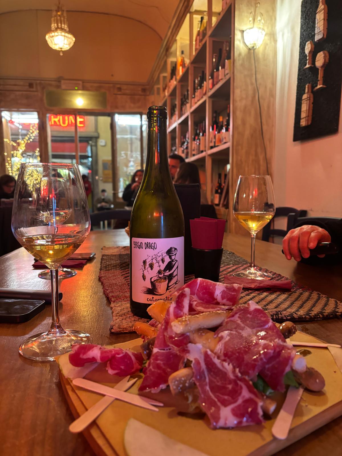Bottega Corsallo – Zona Vucciria. Un indirizzo a metà tra enoteca e bottega contemporanea. Qui il focus è su vini naturali e artigianali, con una selezione curata soprattutto tra Sicilia e poi il resto d’Italia. Lo spazio è essenziale, informale, pensato più per la sosta che per la ristorazione vera e propria. In accompagnamento, pochi piatti e sfizi stagionali: taglieri, conserve, preparazioni semplici che seguono la stessa filosofia dei vini. È uno di quei posti dove fermarsi per un calice e rilassarsi.